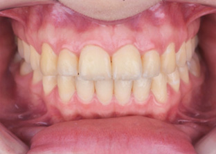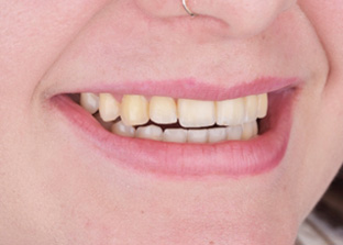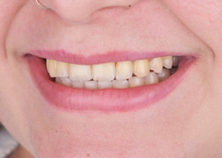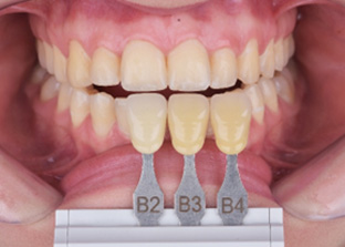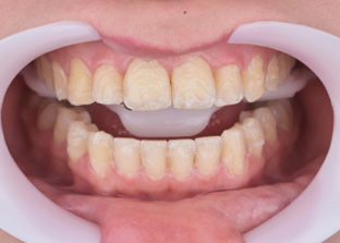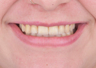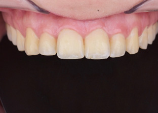 In the first appointment, arch prophylaxis was performed. At the next appointment, the initial shade of the patient’s teeth was taken (A-D shade guide), identifying shades B2 for the upper central incisors and B3 for the upper canines. Then, the arches were molded with alginate to obtain plaster models. Using these models, customized 1mm thick Whiteness silicone molds were made using a vacuum laminating machine. The trays were trimmed 1 mm above the gingival level and tested for fit, retention, and comfort. The next step was to carry out the first in-office whitening session. First, the Arcflex lip retractor was fitted to the patient’s mouth, and a desensitizer based on potassium nitrate and sodium fluoride, Desensibilize KF 2%, was applied to the teeth for 10 minutes. The gel was removed with plenty of water, and the teeth were dried with an air spray. Then, the Top Dam gingival barrier was applied to the region of the teeth where the whitening gel would be applied, in order to avoid contact of the gel with the gingival tissue and sealing the cervical region of the teeth that could have some dentin exposure, followed by photoactivation with Quazar for 10 seconds on each tooth involved. The application of the whitening gel with hydrogen peroxide Whiteness HP AutoMixx 35% PLUS was then started on the teeth, covering the upper (16 to 26) and lower (35 to 45) teeth. As the product presentation has a self-mixing tip, the first portion of the mixture was discarded until the hydrogen peroxide and thickener were homogenized. After 40 minutes of action, the excess gel on the teeth was sucked off with the aid of a surgical suction device, followed by abundant washing with water. At the end of the session, the patient was given customized trays along with White Class 7.5% hydrogen peroxide gel. The patient was instructed to apply a small drop of the whitener to the vestibular surfaces of the same teeth involved in the in-office whitening. It was recommended to use it for 1 hour a day, in the weeks between in-office sessions. At the end of the treatment, three in-office whitening sessions and 11 home whitening sessions were performed, with an interval of 14 days. As a final result, we obtained a significant shade change, going from shades B2 and B3 to shades BL3 and BL4.
